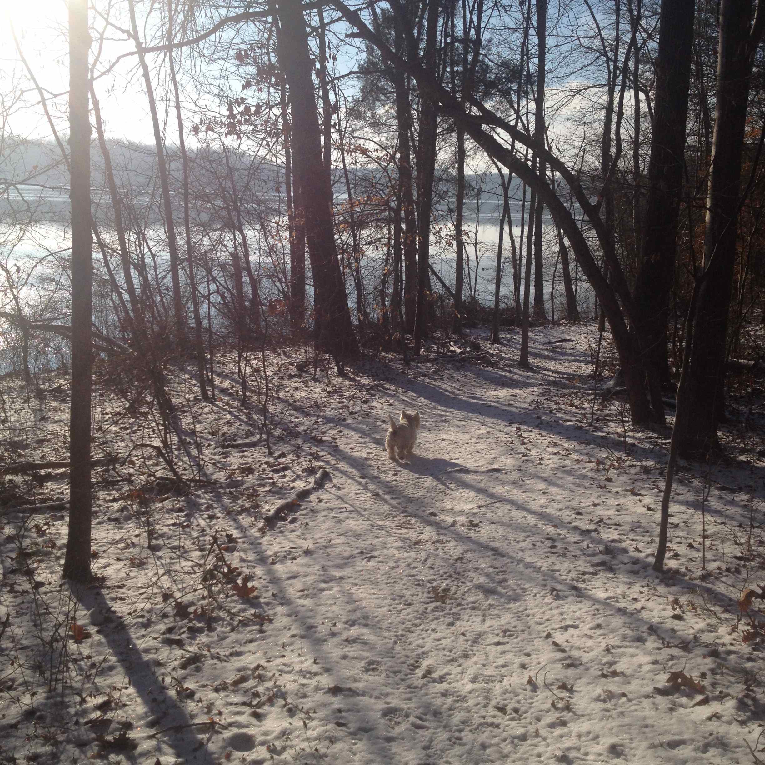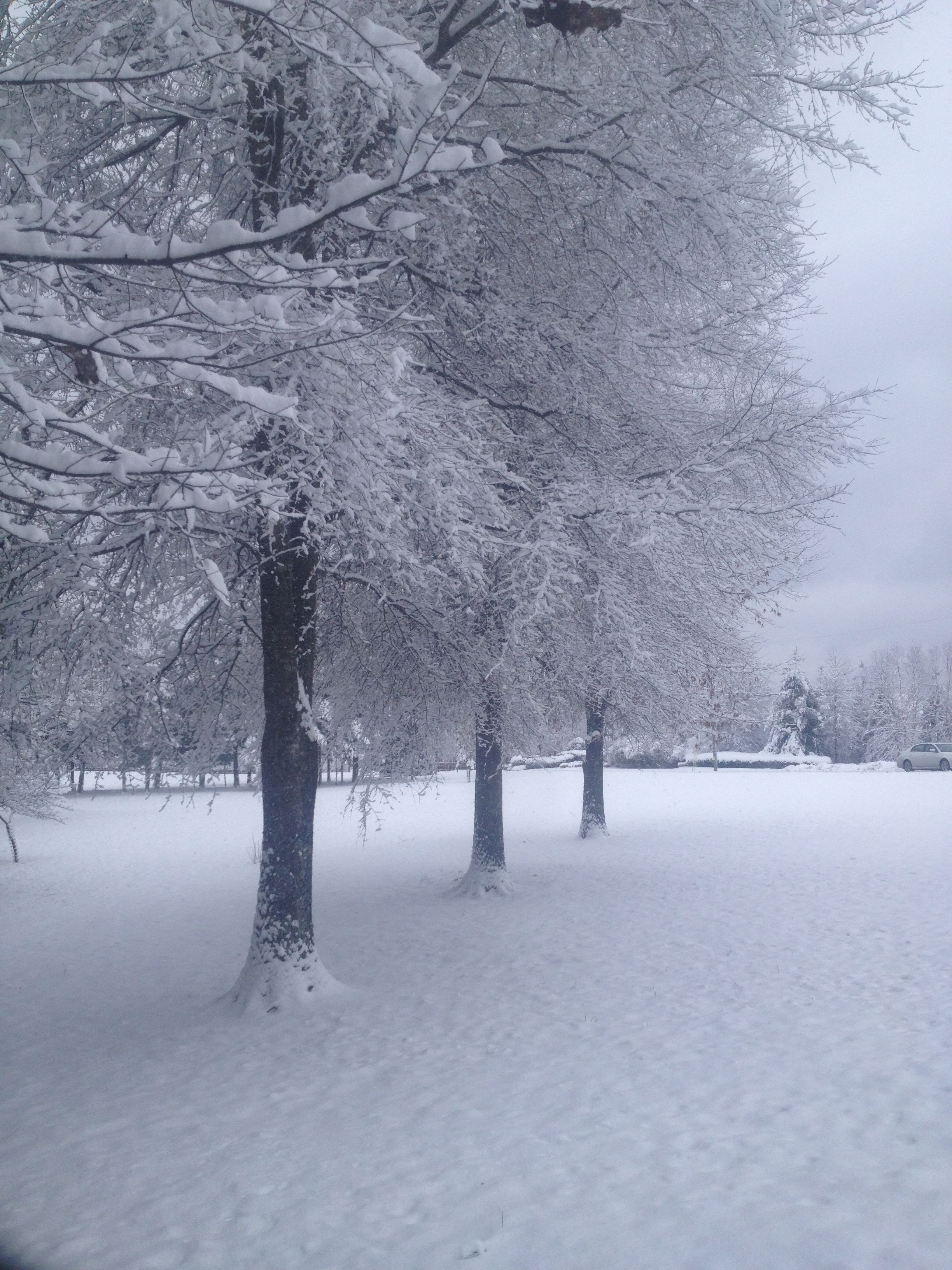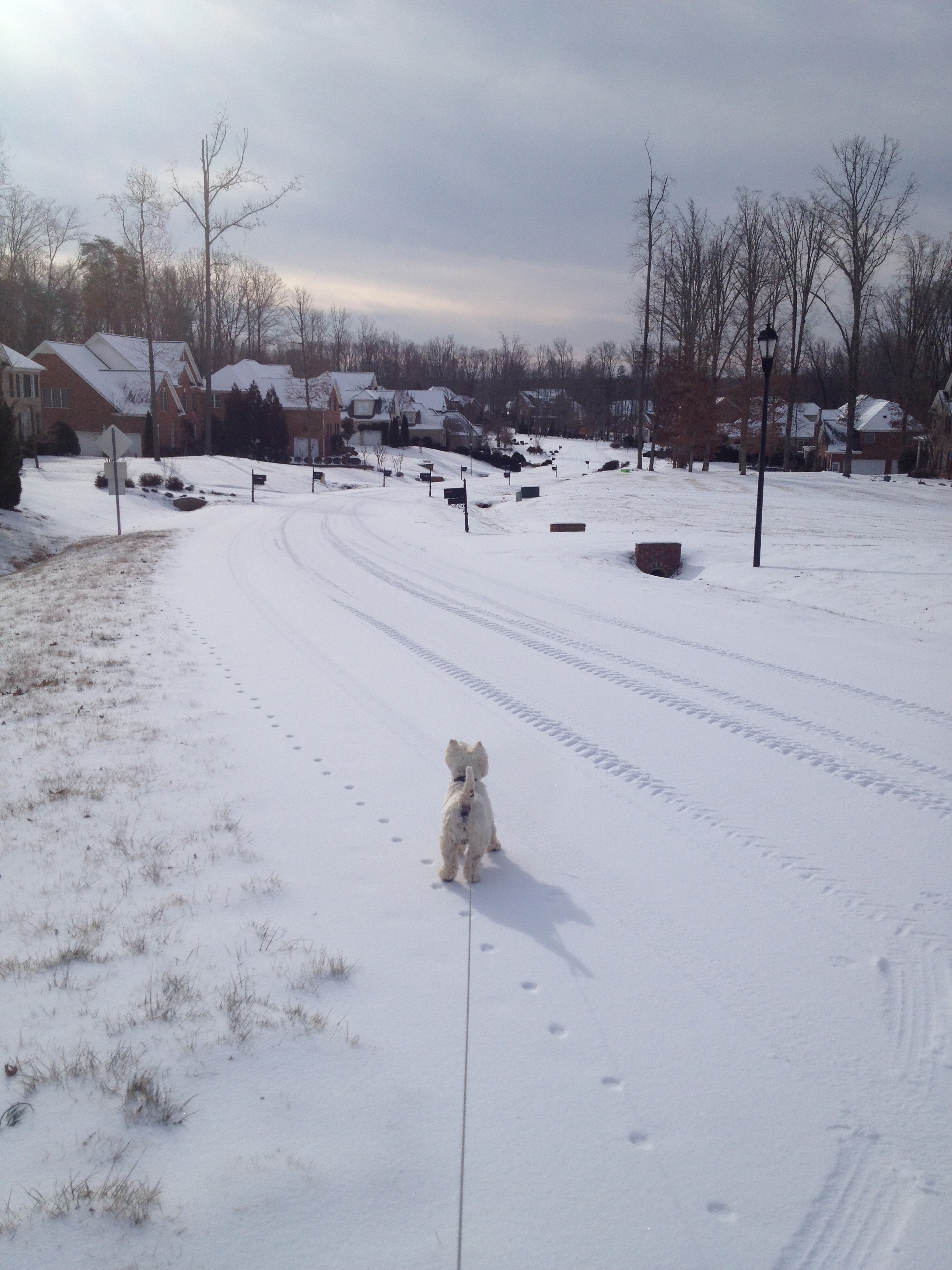 Dan efter var det ju en knapp inch med snö på marken, så skolorna öppnade två timmar senare. Jag fick en fin promenad med hundarna i alla fall, snön var puderlätt, torr och fin, och det var jättevackert ute: