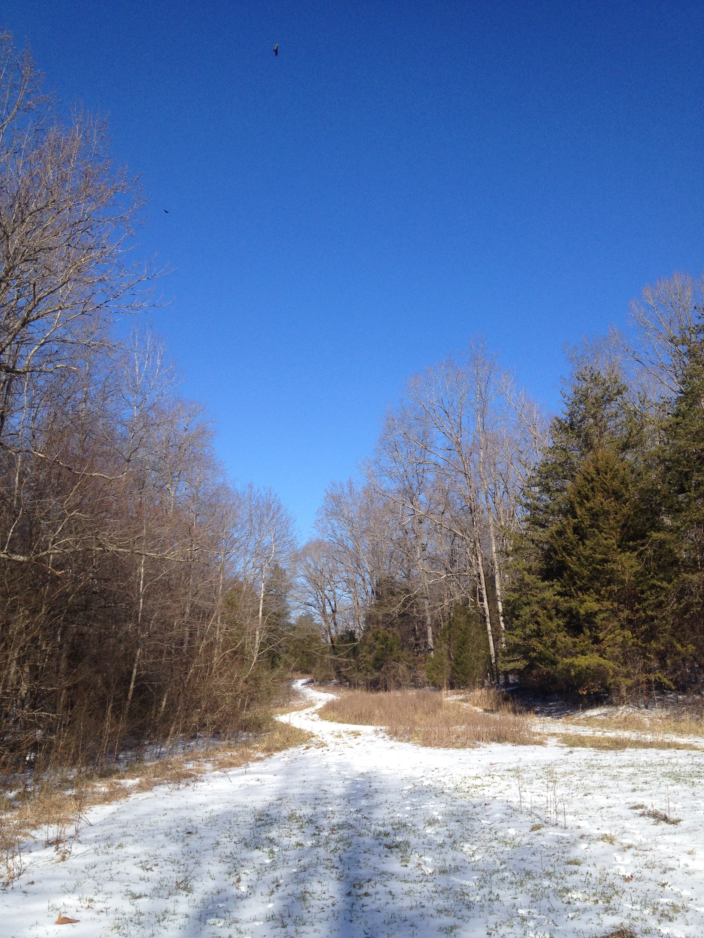 Det var fruktansvärt halt eftersom det kommit isregn kvällen innan som lagt sig som glasyr ovanpå snön. Annars var det en ljuvlig dag, kallt som sagt men molnen försvann fort och den klarblå North Carolina-himlen förnekade sig inte idag heller: