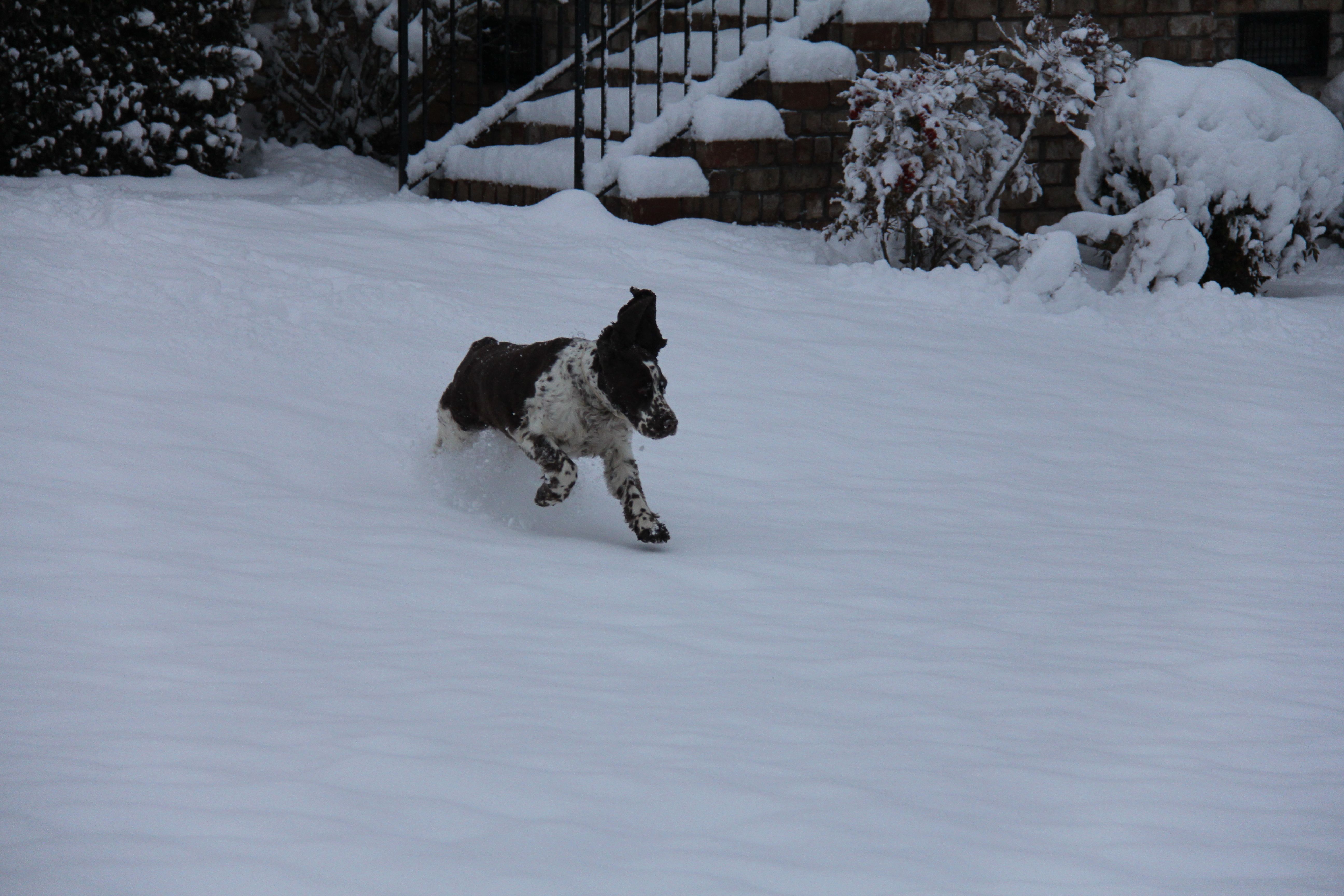 Jag tog ut hundarna för lite bus i snön, och jösses vad förvånade de var! Morris verkade som om han glömt vad snö är, han som fullkomligt älskade snö när vi bodde i Sverige! Han gick ut och luktade misstänksamt på det vita, och sprang sen tillbaka och satte sig vid dörren och tittade misstänksamt på snöflingorna som singlade ner: