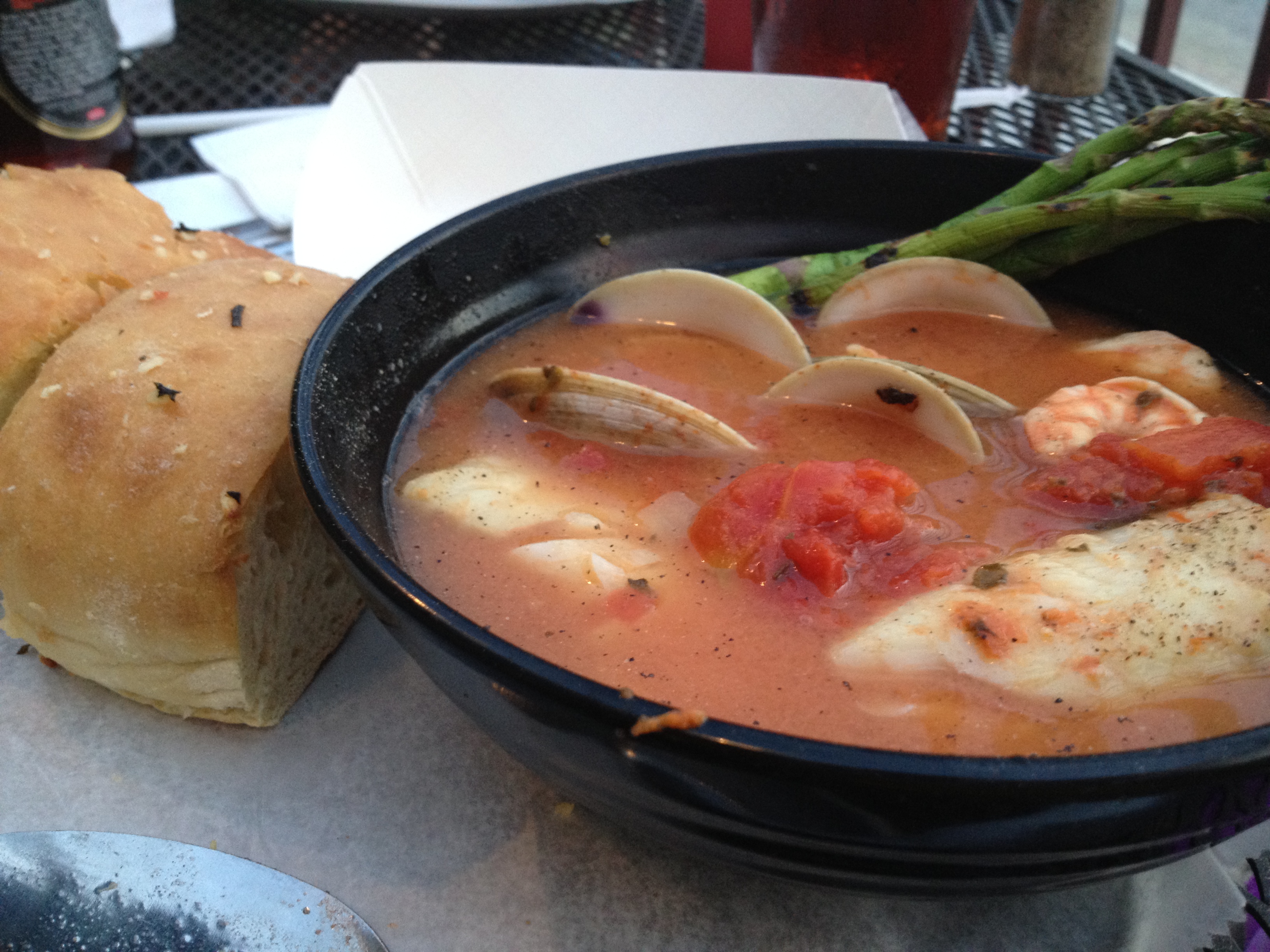 Först får man in en liten skål med kycklingssoppa, som är en buljong egentligen, som aptitretare plus en skål med sallad. Sedan kom kocken in och började ”showen”. Först hällde han på olja på stekbordet och tände på så att det slog upp en jättestor eldslåga. Effektfullt, och man vaknade garanterat till i alla fall! 🙂