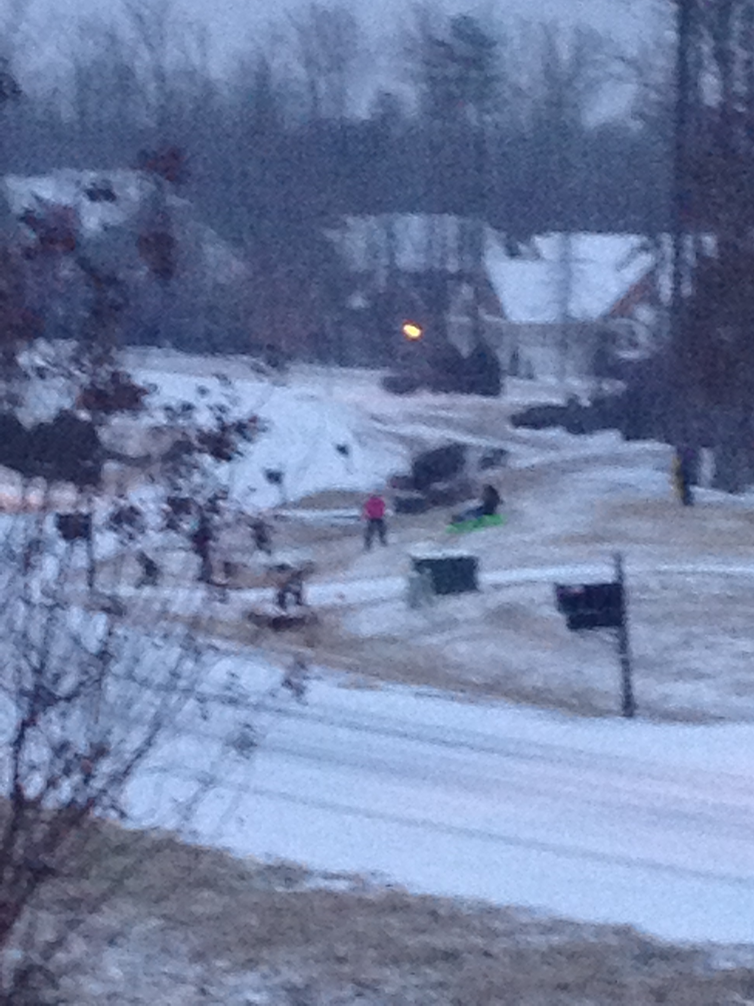Här hemma var barnen på gatan snabba med pulkorna också, och hade jättekul med den lilla snön som hade hunnit lägga sig: