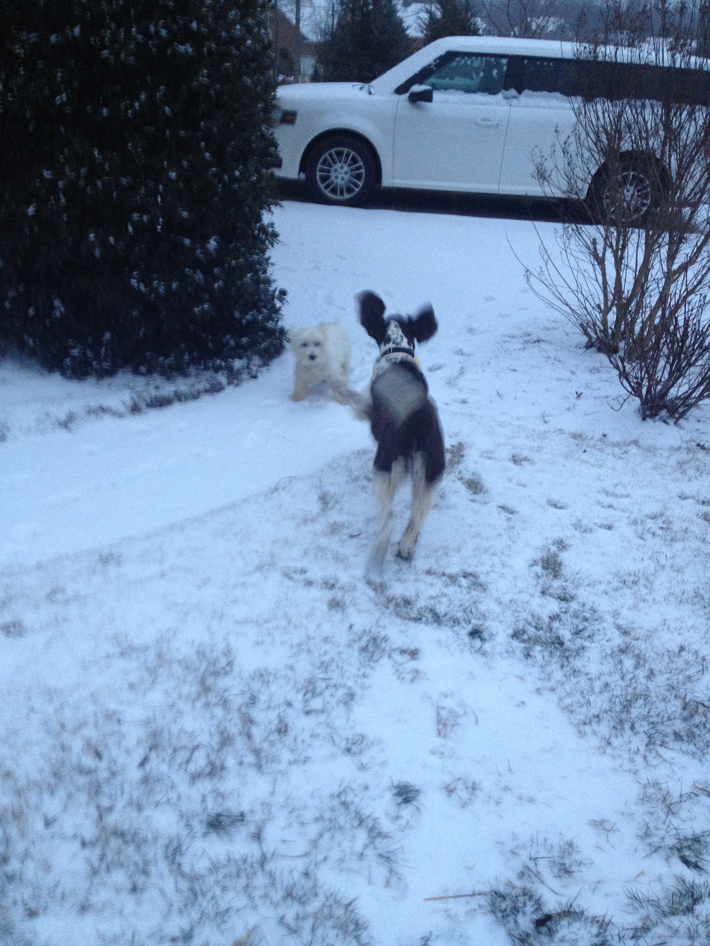Jag tog ut hundarna för lite bus i snön, och jösses vad förvånade de var! Morris verkade som om han glömt vad snö är, han som fullkomligt älskade snö när vi bodde i Sverige! Han gick ut och luktade misstänksamt på det vita, och sprang sen tillbaka och satte sig vid dörren och tittade misstänksamt på snöflingorna som singlade ner: