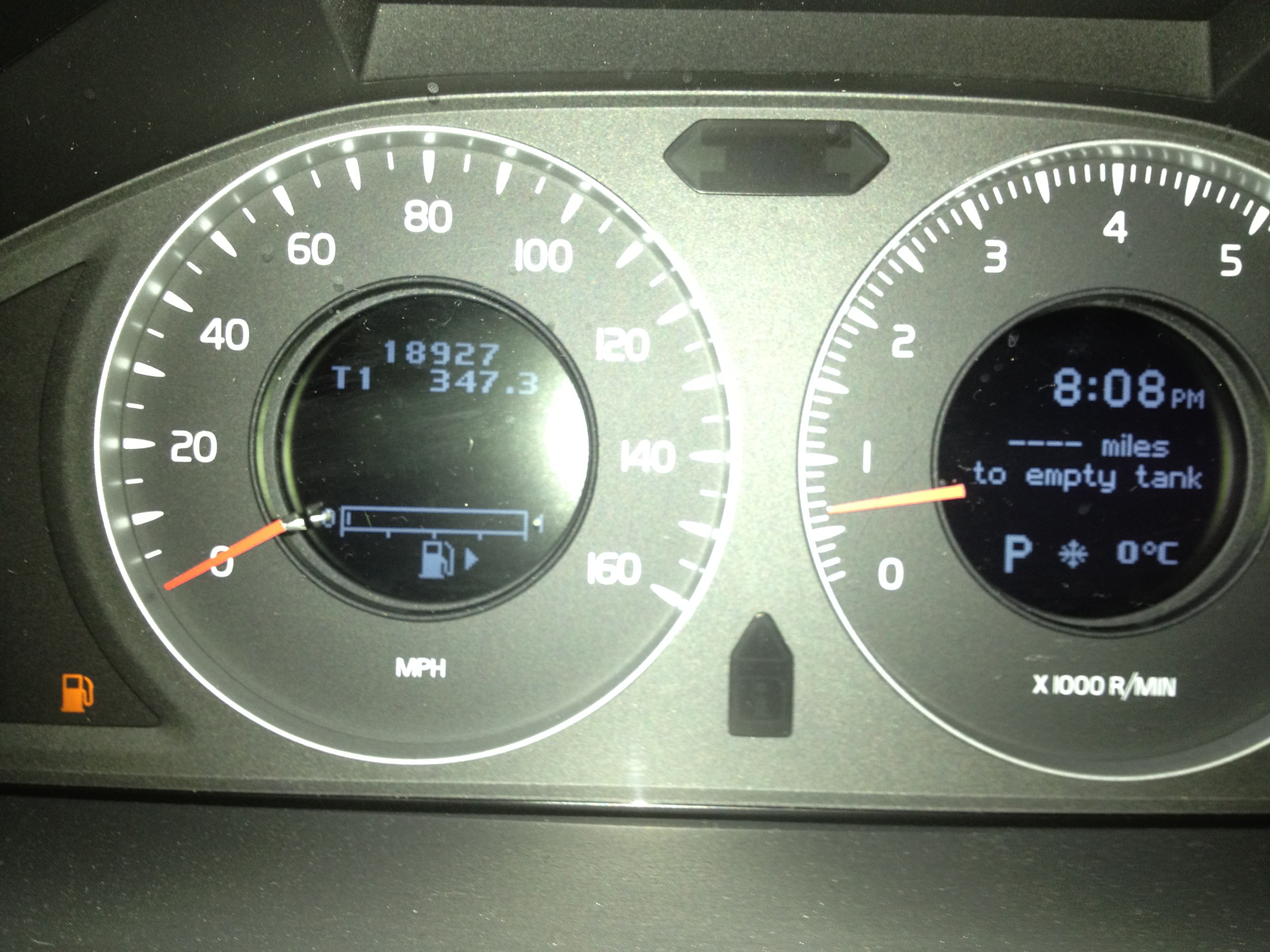 Vi strök alltså idén att kolla på grillar, men däremot var det tämligen tomt i tanken så vi var tvungna att tanka för att kunna ta oss hem. Mot närmsta bensinstation, med andra ord. Det fanns en ganska nära, skönt eftersom det inte var många droppar kvar i tanken nu. Det såg ganska mörkt ut när vi körde in där, men det var ju automatiska pumpar så det borde ju inte vara något problem trodde vi. Tji fick vi. På dörren hängde en skylt att de stängt tidigare pga vädret, och pumparna funkade inte! Ok att det snöade, men att stänga en bensinstation bara för det? Märkligt. Nu började det bli kris, enligt mätaren skulle bensinen räcka i 15 miles till. Enligt gps’en var det drygt 3 miles till nästa bensinstation, bara att hoppas att den var öppen… Jag vet inte hur den där mätaren räknade, men antalet miles kvar till tom tank minskade betydligt snabbare än antalet miles vi körde. På vägen körde vi förbi 5 (!) bilar som låg i diket. När vi äntligen kom fram till bensinstationen (som var öppen, tack och lov) såg mätaren ut såhär, notera antalet miles till tom tank: