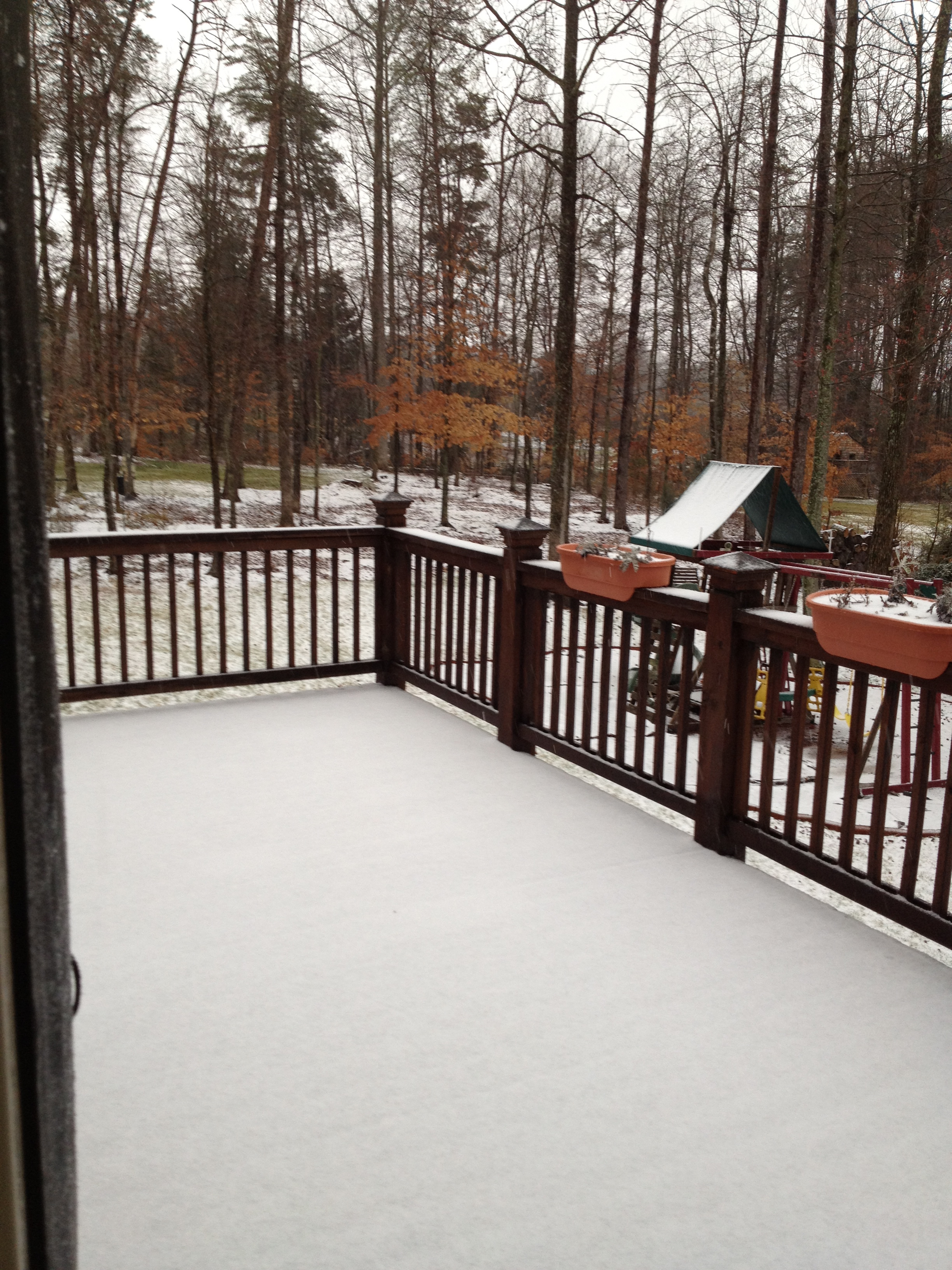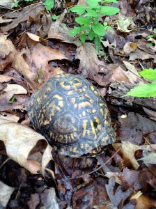 Alldeles fritt ute i skogen! Någon som vet om det finns vilda (nåja, så väldans vild var den kanske inte men icke-tam i alla fall 🙂 ) sköldpaddor i North Carolina? Eller kan den ha rymt eller blivit utplacerad av någon som tröttnat på den? Jag ville inte störa den mer än nödvändigt så jag nöjde mig med att plåta den när inte hundarna såg. Jättegullig var den, och väldigt effektivt kamouflagefärgad. På förekommen anledning går jag inte längre och tittar upp så mycket utan spanar hela tiden efter ormar, annars hade jag aldrig sett den.