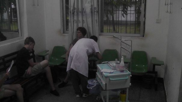 I Kina tror man inte riktigt på medicin i pillerform, dropp ska det vara! Det är därför det hänger så många krokar i taket i väntrummet som man ser på den första bilden, det är där man hänger droppställningarna. Kommer man in på dagen så ser man hela väntrummet fullt med folk som sitter fjättrade vid varsin droppställning. Men effektivt var det, jag var i princip frisk efter tre dagar.