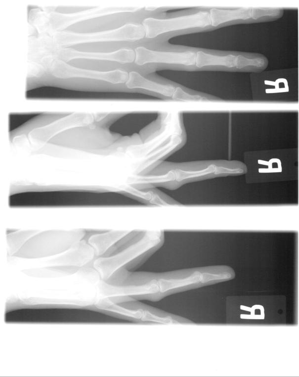 Sen var det dags för röntgen för att se om fingret var brutet. Det visade sig att det lossnat en liten, liten flisa vi den första leden på fingret. Dock behövde jag inte gipsas som tur var, utan han tejpade ihop fingret med långfingret istället. Om inte svullnaden och värken gått ner betydligt om två veckor så måste jag dit igen, annars ska det vara helt läkt om fyra veckor. En kul grej: när vi gick därifrån fick vi med oss röntgenplåtarna på en cd-skiva! Så om någon vill se hur mitt finger ser ut så har ni det här (det är alltså röntgat efter att han dragit fingret i rätt läge så det ser inte läskigt ut: