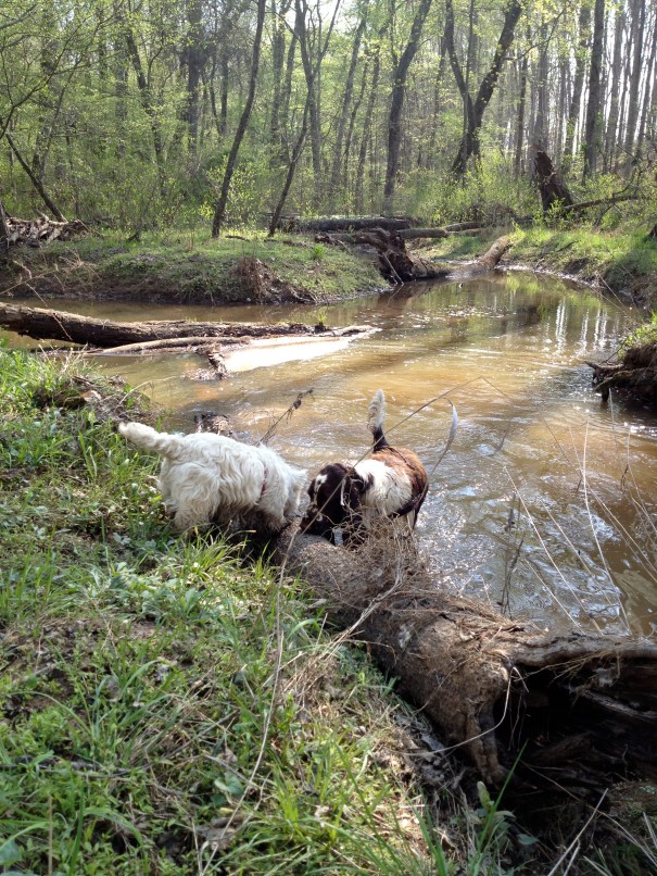 Dagen efter ortopeden gick Max halvdag i skolan. Jag skulle hämta honom vid 11.30 och stack iväg ut med hundarna innan på förmiddagen. Vi gick till en skog en liten bit bort i området där vi bara varit en gång förut. Bland annat finns där en liten å som hundarna älskar att bada i och det ser riktigt regnskogsaktigt ut: