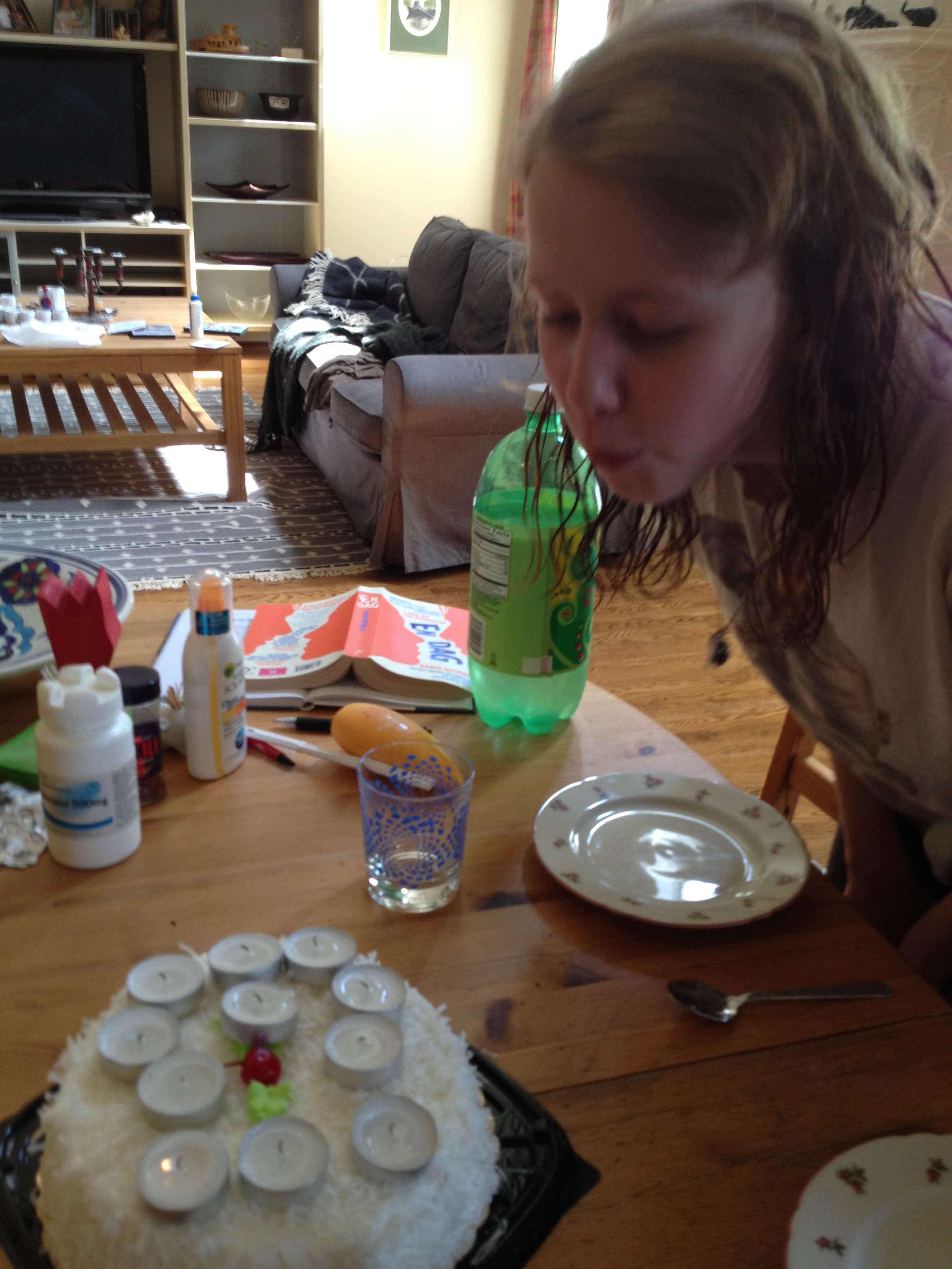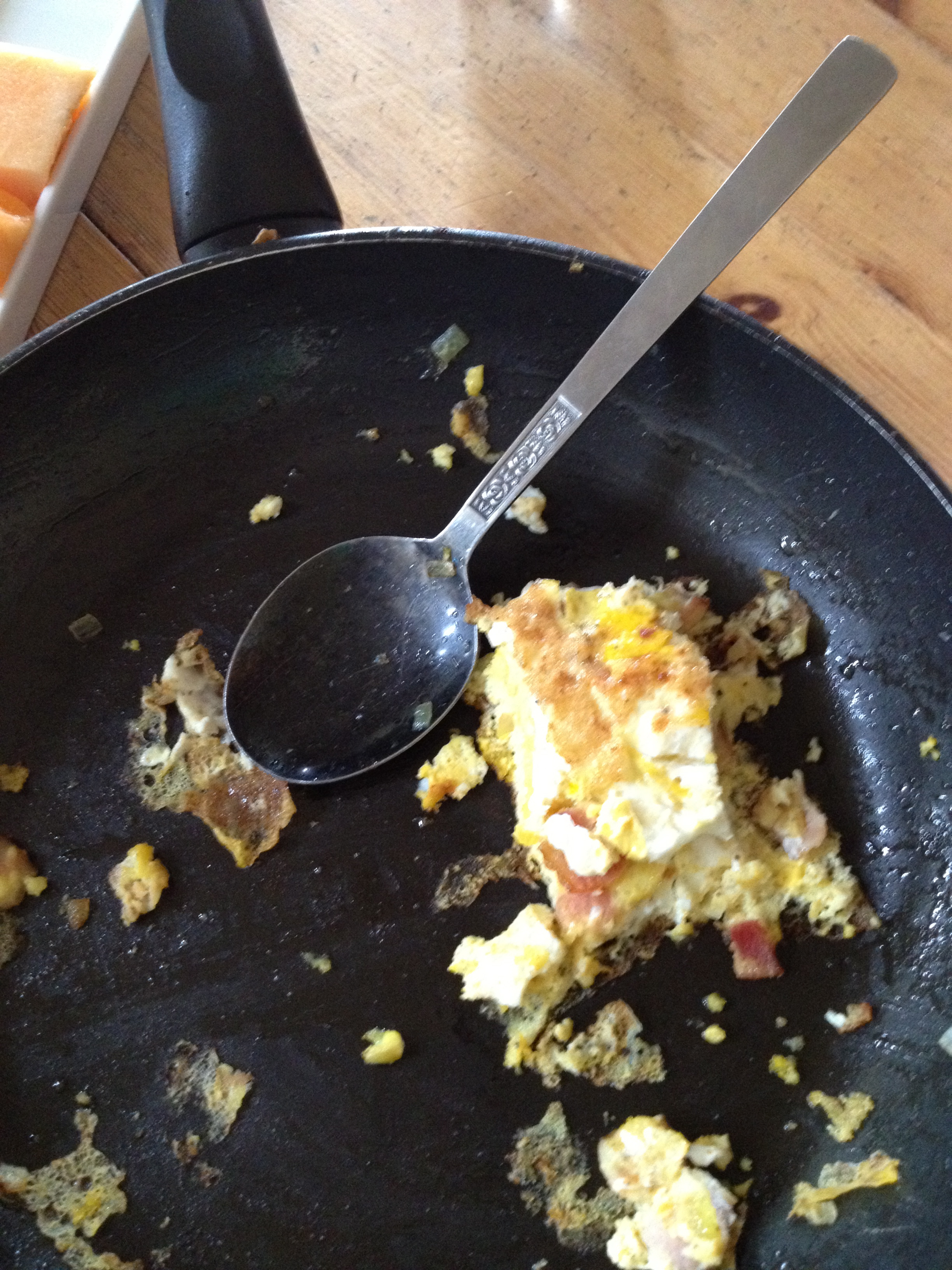 10.30 Frukosten avslutad. Tess fick välja frukost idag och ville ha omelett med bacon i (som vi förstås inte hade hemma för en gångs skull så Björn fick göra en blixtutryckning till affären). Den blev väldigt god, det mesta gick åt som synes! 🙂
