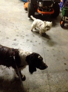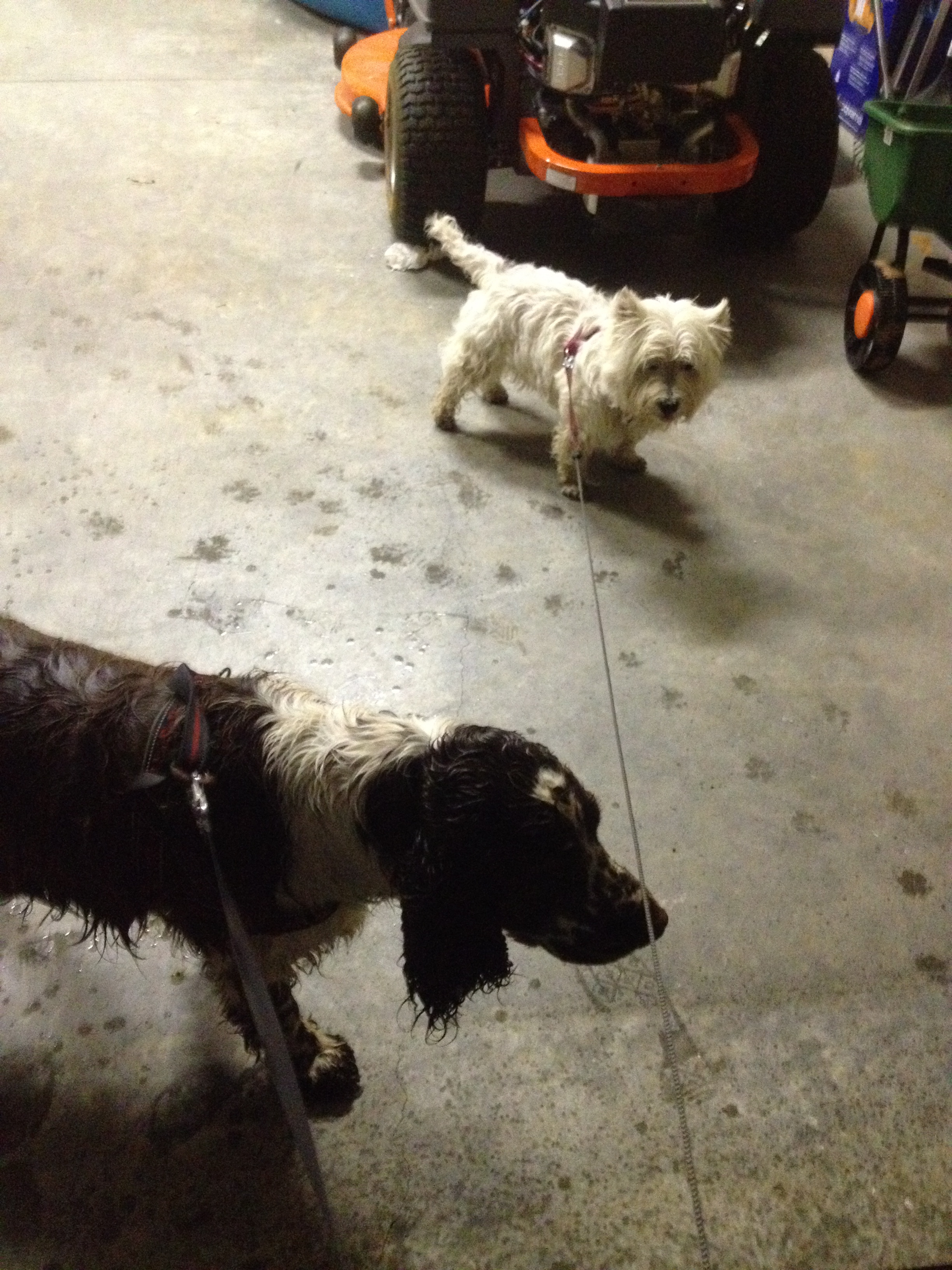 20.35 Hemma i garaget efter kvällspromenaden. Det hade kommit en enorm åskknall (blixten och åskan kom precis samtidigt så det var precis över oss) nån halvtimme innan men nu var åskan över. Jag hade tänkt att gå vår vanliga 30-minutersrunda men efter bara kanske 100 meter så kom det en störtskur, en sån där där man hör regnet när det är på väg ner alldeles innan det kommer. Båda hundarna vände mitt i ett steg och ville hem igen så det blev en betydligt kortare runda… 🙂