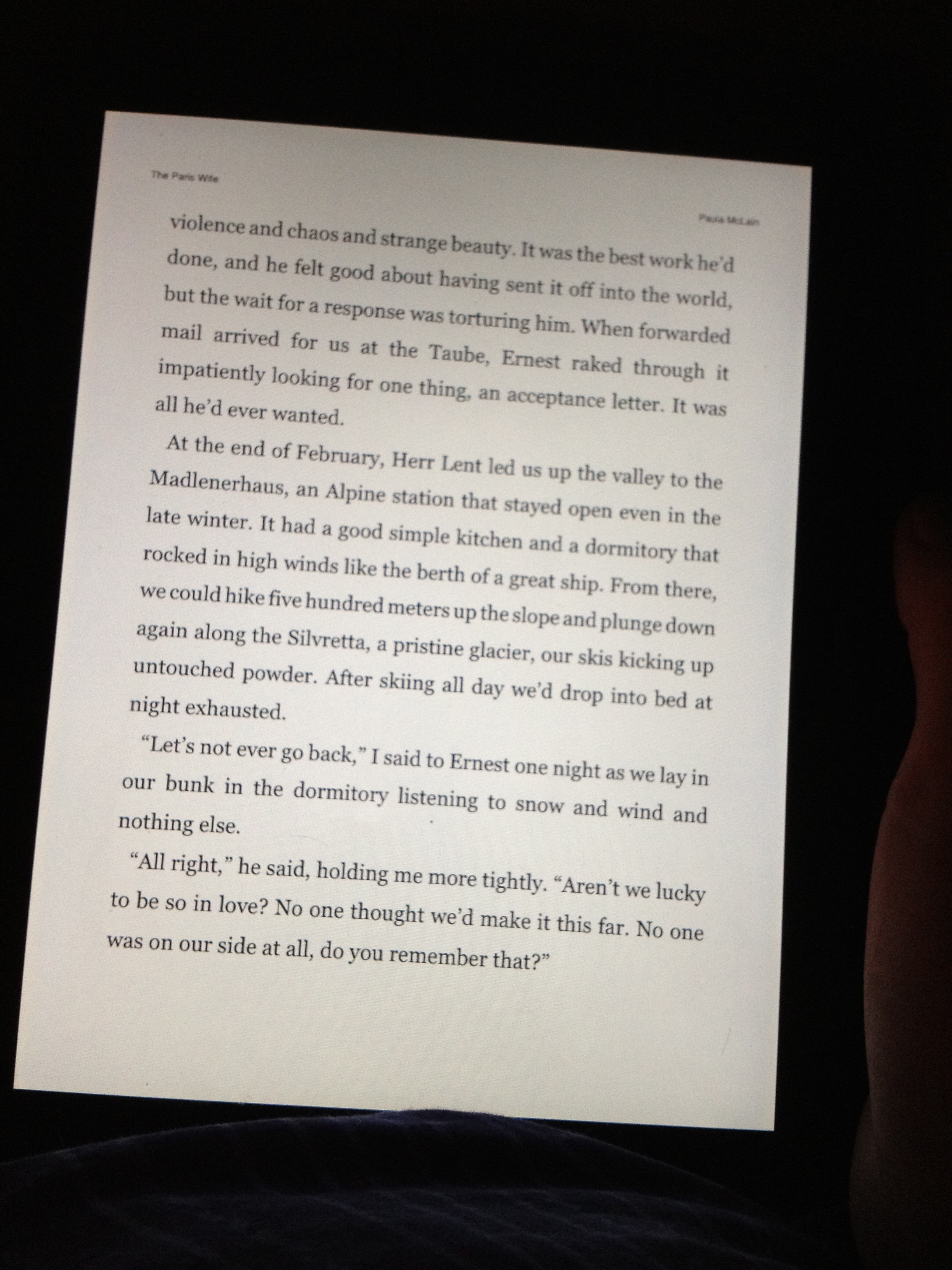 23.30 Ligger och läser på min älskade iPad innan det är dags att sova. Håller fortfarande på med The Paris Wife, bokklubbsboken, men hoppas bli klar med den denna helgen så att jag kan börja med nästa.