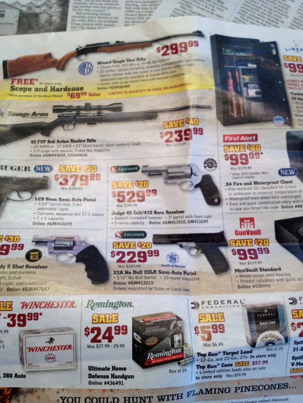 Det var reklam för friluftskläder, flugfiske, jaktgevär och – pistoler. Även om man vet att det är så i det här landet så hajar man ändå till. I dagens tidning var det en artikel om att en 17-årig svart kille blivit ihjälskjuten. Han hade tydligen varit och handlat godis och var på väg hem genom ett ”gated community” (ett inhägnat bostadsområde). Detta område hade även en vakt, som tyckte att 17-åringen såg skum ut och att han tittade konstigt på husen i området. Han ringde tydligen 911, men istället för att vänta på att de skulle komma, eller åtminstone försöka prata med killen, så tar han upp sin pistol och skjuter honom. Det skrämmande med artikeln är att den inte överhuvudtaget ifrågasätter att vakten hade en skarpladdad pistol med sig. Inte ett ord om hur fel det blir när vem som helst springer omkring med vapen, eller det skrämmande med att en vakt – som borde vara aningens utbildad på det han jobbar med och inte borde anta att varje färgad person han ser är en potentiell brottsling – tar upp pistolen och skjuter.