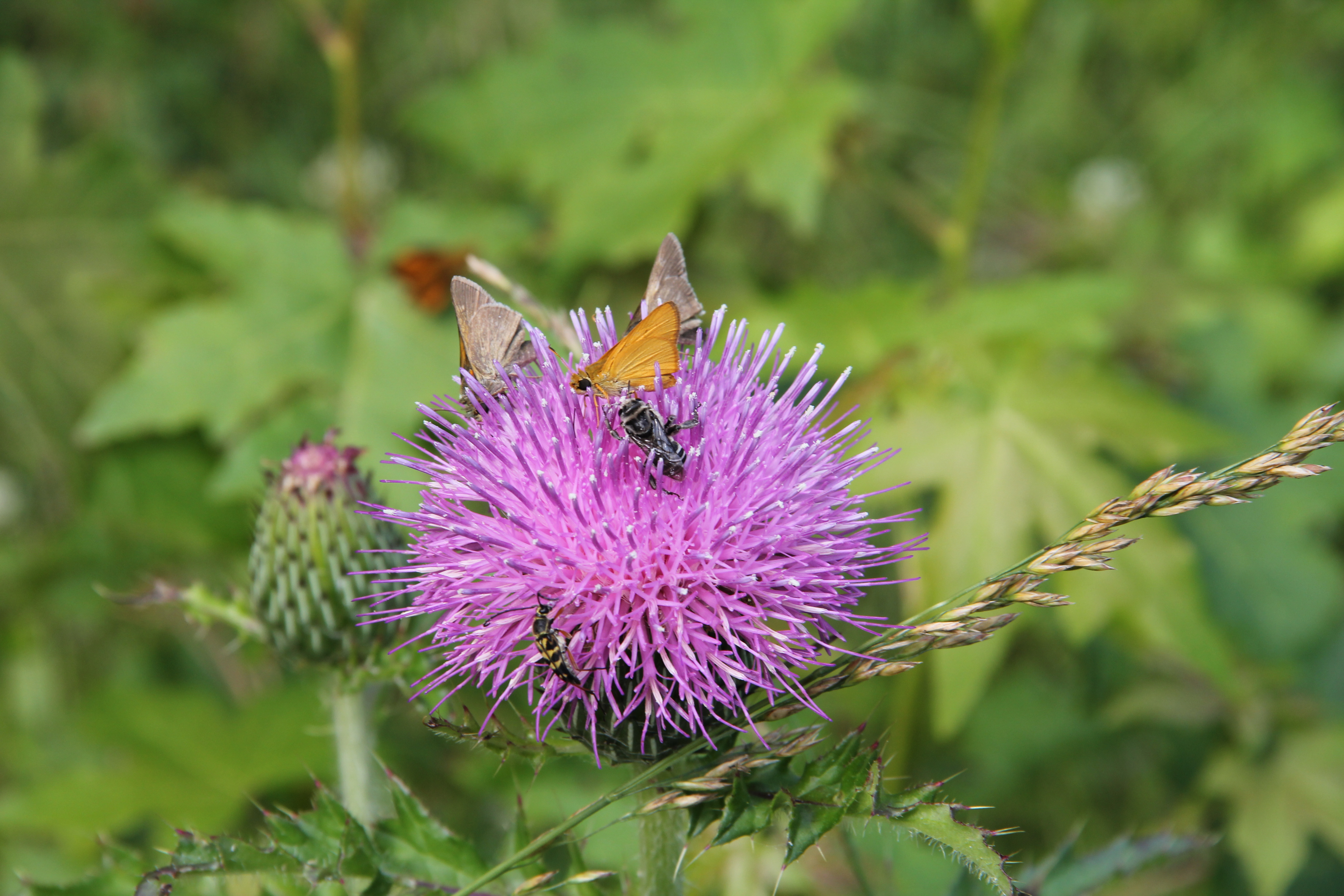 Den här blomman var populär, fyra småfjärilar och två getingliknande saker kravlade runt på den: